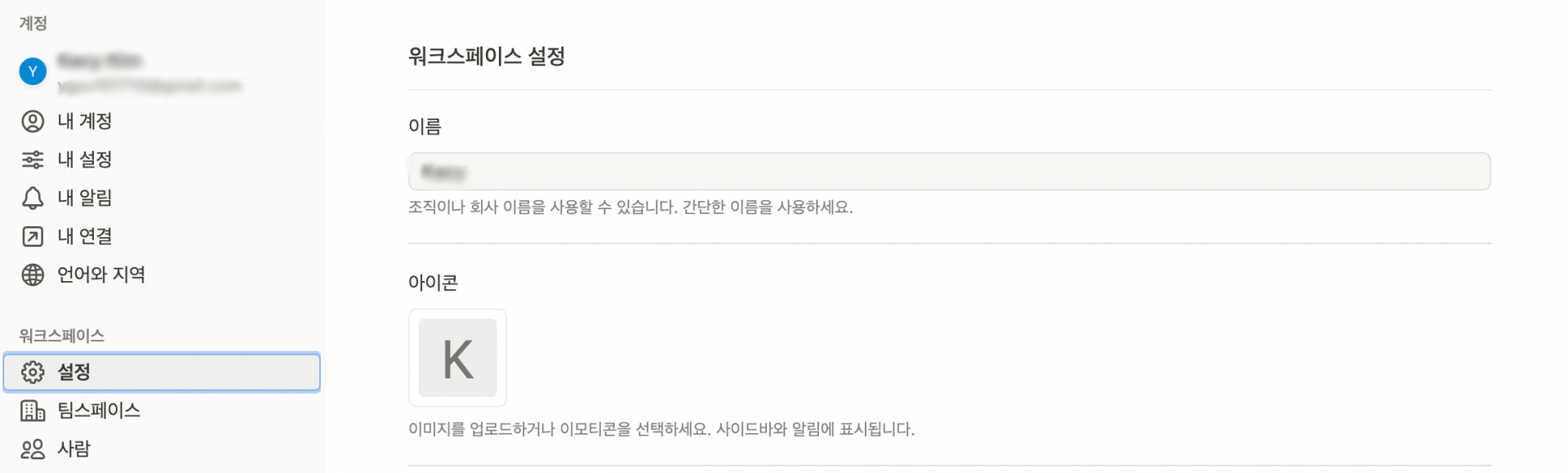 ✔️ 2단계: 워크스페이스의 설정을 클릭하면, 프로필을 변경할 수 있는 화면이 나타납니다.