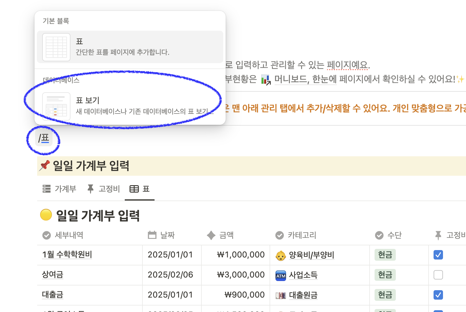 1️⃣ 이미지 처럼 표 보기 입력 후, 기존 가계부 데이터베이스인 일일 가계부 입력을 선택해서 연결해 줍니다.