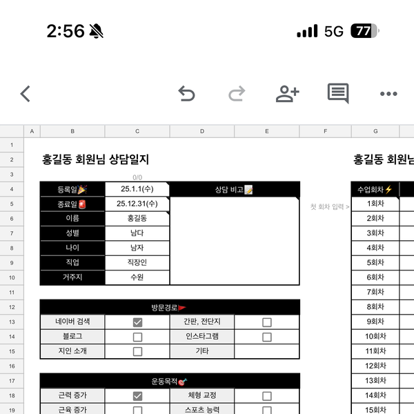 구글시트로 되어있어서 휴대폰이나 컴퓨터로 언제든지 편하게 트쌤일지 작성할 수 있어 편하고 회원 관리에 유용합니다. 고객 상담할때도 데이터를 회원별로 디테일하게 운동기록, 피티기록, 인바디기록 등 누적해 관리 할 수 있어서 회원권 연장할때도 유용해요👏🏻💖
